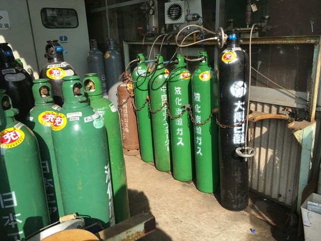 ガスボンベ置き場鉄工所によく置いてあるガスボンベです。毎日ボンベの栓を開けることから仕事が始まりますwガス切断で使うのが酸素(黒)、アセチレン(茶)で、沢山ある炭酸ガス(緑)は半自動溶接のガ…